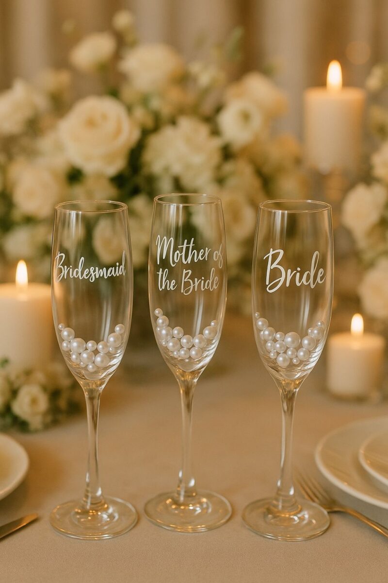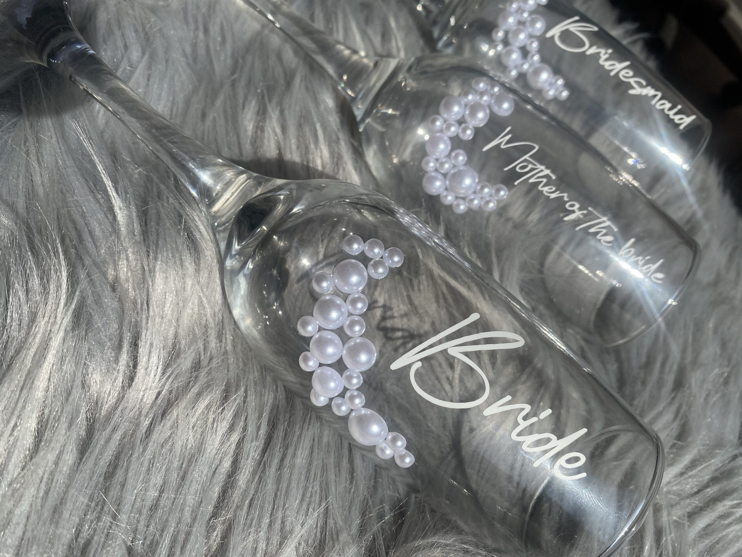 Sip in style with this beautifully crafted champagne glass, adorned with delicate pearl accents. Perfect for toasts, photos, and cherished memories, it adds a touch of timeless elegance to your wedding celebration. Because every love story deserves a little sparkle and sophistication.
